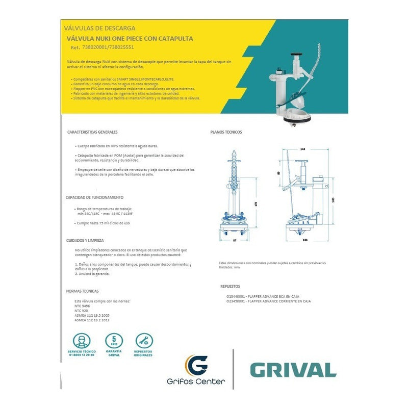 Válvula descarga Nuki una pieza catapulta SKU:738020001 ¡Adquiere las válvula de descarga Nuki con sistema de desacople! permiten levantar la tapa del tanque sin activar el sistema ni afectar la configuración. -Garantiza un bajo consumo de agua en cada descarga. -Flapper en PVC con exoesqueleto resistente a condiciones de agua extremas. -Sistema de catapulta que facilita el mantenimiento y la durabilidad de la válvula. -Venta factura régimen común. -También contamos con variedad de tonos. -Somos fabricantes de sus ideas. ----SE REALIZA ACABADO (ANTIGUO) A TODA CLASE DE GRIFERÍAS NUEVAS O USADAS----- ¿Generan factura legal y electrónica? Si. generamos factura legal con IVA , somos régimen común y realizamos facturación electrónica. ¿Mi compra tiene garantía? Si. todos nuestros productos son nuevos y cuentan con garantía oficial. Se entregan en sus empaques o cajas. ¿Tiene punto de venta? Somos GRIFOS CENTER y tenemos nuestro punto de venta, puedes recoger tus productos directamente si deseas. ¿Dónde están ubicados? No solo somos tienda online, también tenemos tienda física con un amplio Stock de nuestros productos para envío inmediato, GRIFOS CENTER esta ubicado en el Norte de Bogotá podemos entregarte el mismo día dependiendo el producto y cantidad. •Recuerda que somos GRIFOS CENTER para mayor información •Puedes recoger en nuestro punto de venta. ¿ Son fabricantes? - Si, GRIFOS CENTER es fabricante directo de griferÍas VINTAGE (fabricando tus ideas y ofreciendo diferentes estilos de acabados para tu grifería). Además brindamos una amplia variedad de productos institucionales y para el hogar con la mejor calidad. ¿Ofrecen productos al por mayor? - Si, en GRIFOS CENTER contamos con un amplio inventario y variedad de productos para atender proyectos grandes como lo son las constructoras , hoteles , colegios y grandes superficies. ¿ Hacen envíos a nivel nacional? - Si GRIFOS CENTER realiza envíos a nivel nacional. ¿Se pueden retirar los productos en el punto de venta? Tenemos la posibilidad de retirar el producto en nuestro punto de venta o enviar por otra transportadora colocando recojo en el domicilio del vendedor este ultimo el comprador cancela el envio cuando llegue el producto. ¿Qué garantías manejan? -Según la referencia comprada generalmente tiene garantía de 1 año donde nos podrás informar cualquier inconveniente NOTA: Los logos en la publicacion son marcas de agua el producto te llegara sin este logo ----------------------SOMOS IMPORTADORES CON MARCA PROPIA---------------------------