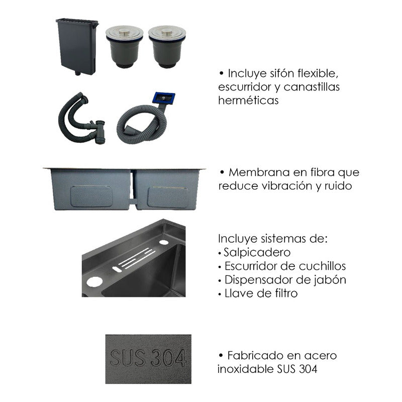 Lavaplatos Doble Pozo con Escurridor Negro+ Accesorios SKU:KRP-902/8245 BLACK INCLUYE: Incluye sistemas de: -Salpicadero - Escurridor de cuchillos -Dispensador de jabón -Llave de filtro -Sifón flexible escurridor y canastillas herméticas -Membrana en fibra que reduce vibración y ruido PREGUNTAS FRECUENTES ¿GENERAN FACTURA? Sí, emitimos facturas legales con IVA incluido. Somos un régimen común y realizamos facturación electrónica. ¿MANEJAN VARIEDAD DE TONOS? Sí, manejamos una amplia gama de colores, como bronce y cobre antiguo, para personalizar tus griferías y accesorios. Realizamos acabados de aspecto antiguo en griferías nuevas o usadas. Transformamos tus griferías para darles un toque clásico y elegante. ¿SON FABRICANTES? Sí, somos fabricantes de tus ideas. Fabricamos hermosas griferías y accesorios de excelente calidad para embellecer tus espacios de la mejor manera. En GRIFOS CENTER, convertimos tus ideas en realidad. Fabricamos griferías VINTAGE y ofrecemos diversos estilos de acabados antiguos para tus griferías y accesorios. Además, proporcionamos una amplia variedad de productos de alta calidad para el hogar y productos institucionales para tus proyectos. ¿GENERAN FACTURA LEGAL Y ELECTRÓNICA? Sí, generamos factura legal con IVA incluido y ofrecemos facturación electrónica. ¿MI COMPRA TIENE GARANTÍA? Todos nuestros productos son nuevos y cuentan con garantía oficial de 1 año. Se entregan en sus empaques o cajas originales. ¿TIENEN PUNTO DE VENTA? Sí, somos GRIFOS CENTER y tenemos un punto de venta físico donde puedes recoger tus productos directamente si lo deseas. ¿DÓNDE ESTÁN UBICADOS? Nos encontramos en el Norte de Bogotá. Tenemos un amplio stock de nuestros productos para envío inmediato. Además, ofrecemos la opción de recoger tus compras en nuestro punto de venta. ¿MANEJAN PRODUCTOS PARA PROYECTOS? Sí, ofrecemos una amplia variedad de productos y contamos con un extenso inventario para atender proyectos grandes, como constructoras, hoteles, colegios y grandes superficies. ¿OFRECEN PRODUCTOS AL POR MAYOR? Sí, contamos con un extenso inventario y una gran variedad de productos para atender tus solicitudes. ¿HACEN ENVÍOS A NIVEL NACIONAL? Sí, GRIFOS CENTER realiza envíos a nivel nacional. ¿SE PUEDEN RETIRAR LOS PRODUCTOS EN EL PUNTO DE VENTA? Ofrecemos la opción de retirar productos en nuestro punto de venta o de enviarlos por otra transportadora, seleccionando "recojo en el domicilio del vendedor". En este caso, el comprador se encarga del costo del envío. NOTA IMPORTANTE: Los logos en la publicación son marcas de agua y el producto te llegará sin este logo. ----------------------SOMOS IMPORTADORES CON MARCA PROPIA-----------------------