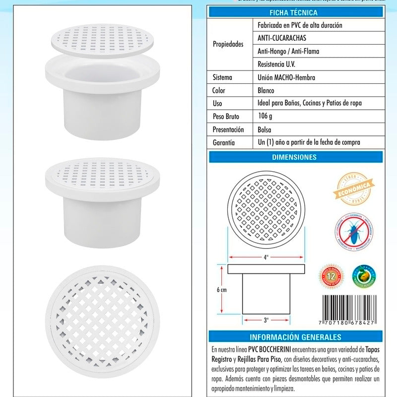 Rejilla de Piso Sifon 3X2 en PVC negra Anticucaracha SKU: RS-3X2AC-07 PREGUNTAS FRECUENTES: ¿GENERAN FACTURA? Sí, emitimos facturas legales con IVA incluido. Somos un régimen común y realizamos facturación electrónica. ¿MANEJAN VARIEDAD DE TONOS? Si, manejamos una amplia gama de colores entre bronce, cobre antiguo para personalizar tus griferías y accesorios. Realizamos acabados de aspecto antiguo en griferías nuevas o usadas. Transformamos tus griferías para darles un toque clásico y elegante. ¿SON FABRICANTES? Si, somos fabricantes de tus ideas, fabricamos hermosas griferias y accesorios de excelente calidad para que amables tus espacios de la mejor manera. En GRIFOS CENTER, convertimos tus ideas en realidad. Fabricamos griferías VINTAGE y ofrecemos diversos estilos de acabados antiguos para tus griferías y acesorios. Además, proporcionamos una amplia variedad de productos de alta calidad para el hogar y productos institucionales para tus proyectos. ¿Generan factura legal y electrónica? Sí, generamos factura legal con IVA incluido y ofrecemos facturación electrónica. ¿Mi compra tiene garantía? Todos nuestros productos son nuevos y cuentan con garantía oficial de 1año. Se entregan en sus empaques o cajas originales. ¿Tienen punto de venta? Sí, somos GRIFOS CENTER y tenemos un punto de venta físico donde puedes recoger tus productos directamente si lo deseas. ¿Dónde están ubicados? Nos encontramos en el Norte de Bogotá. Tenemos un amplio stock de nuestros productos para envío inmediato. Además, ofrecemos la opción de recoger tus compras en nuestro punto de venta. ¿MANEJAN PRODUCTOS PARA PROYECTOS? Sí ofrecemos amplia variedad de productos y contamos con un extenso inventario y una variedad de productos para atender proyectos grandes, como constructoras, hoteles, colegios y grandes superficies. ¿Ofrecen productos al por mayor? Sí, contamos con un extenso inventario y una gran variedad de productos para atender tus solicitudes ¿Hacen envíos a nivel nacional? Sí, GRIFOS CENTER realiza envíos a nivel nacional. ¿Se pueden retirar los productos en el punto de venta? Ofrecemos la opción de retirar productos en nuestro punto de venta o de enviarlos por otra transportadora, seleccionando "recojo en el domicilio del vendedor". En este caso, el comprador se encarga del costo del envío. NOTA IMPORTANTE: Los logos en la publicación son marcas de agua y el producto te llegará sin este logo. ----------------------SOMOS IMPORTADORES CON MARCA PROPIA---------------------------