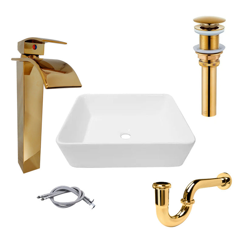 Combo Lavamanos Rectang.+griferia Monoc +push+sifon Oro Gf3