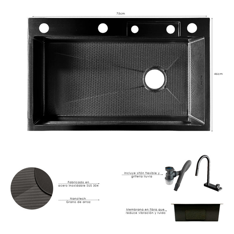 Lavaplatos Inteligente Acero 304 Negro 75X46cm+Griferia Lluvia SKU: RP-FY-002 BLACKv Pestaña: Calibre 11 (3,04 mm) Cuerpo:Calibre 21 (0,84 mm) - Membrana en fibra que reduce vibración y ruido - Incluye sifón flexible, griferia lluvia, tabla, azafate PREGUNTAS FRECUENTES ¿GENERAN FACTURA? Sí, emitimos facturas legales con IVA incluido. Somos un régimen común y realizamos facturación electrónica. ¿MANEJAN VARIEDAD DE TONOS? Sí, manejamos una amplia gama de colores, como bronce y cobre antiguo, para personalizar tus griferías y accesorios. Realizamos acabados de aspecto antiguo en griferías nuevas o usadas. Transformamos tus griferías para darles un toque clásico y elegante. ¿SON FABRICANTES? Sí, somos fabricantes de tus ideas. Fabricamos hermosas griferías y accesorios de excelente calidad para embellecer tus espacios de la mejor manera. En GRIFOS CENTER, convertimos tus ideas en realidad. Fabricamos griferías VINTAGE y ofrecemos diversos estilos de acabados antiguos para tus griferías y accesorios. Además, proporcionamos una amplia variedad de productos de alta calidad para el hogar y productos institucionales para tus proyectos. ¿GENERAN FACTURA LEGAL Y ELECTRÓNICA? Sí, generamos factura legal con IVA incluido y ofrecemos facturación electrónica. ¿MI COMPRA TIENE GARANTÍA? Todos nuestros productos son nuevos y cuentan con garantía oficial de 1 año. Se entregan en sus empaques o cajas originales. ¿TIENEN PUNTO DE VENTA? Sí, somos GRIFOS CENTER y tenemos un punto de venta físico donde puedes recoger tus productos directamente si lo deseas. ¿DÓNDE ESTÁN UBICADOS? Nos encontramos en el Norte de Bogotá. Tenemos un amplio stock de nuestros productos para envío inmediato. Además, ofrecemos la opción de recoger tus compras en nuestro punto de venta. ¿MANEJAN PRODUCTOS PARA PROYECTOS? Sí, ofrecemos una amplia variedad de productos y contamos con un extenso inventario para atender proyectos grandes, como constructoras, hoteles, colegios y grandes superficies. ¿OFRECEN PRODUCTOS AL POR MAYOR? Sí, contamos con un extenso inventario y una gran variedad de productos para atender tus solicitudes. ¿HACEN ENVÍOS A NIVEL NACIONAL? Sí, GRIFOS CENTER realiza envíos a nivel nacional. ¿SE PUEDEN RETIRAR LOS PRODUCTOS EN EL PUNTO DE VENTA? Ofrecemos la opción de retirar productos en nuestro punto de venta o de enviarlos por otra transportadora, seleccionando "recojo en el domicilio del vendedor". En este caso, el comprador se encarga del costo del envío. NOTA IMPORTANTE: Los logos en la publicación son marcas de agua y el producto te llegará sin este logo. ----------------------SOMOS IMPORTADORES CON MARCA PROPIA-----------------------