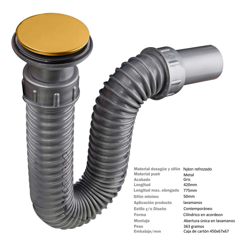 Sifón Lavamanos Flexible Gris Con Push Oro Vintage