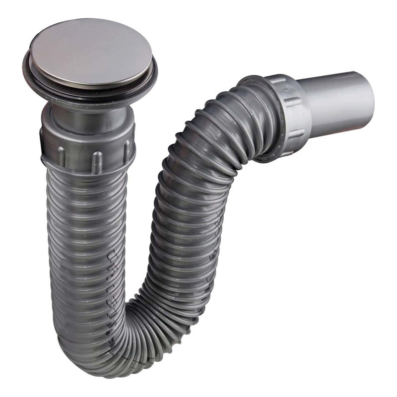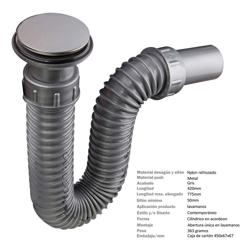 Sifón Lavamanos Flexible Gris Con Push Cromado