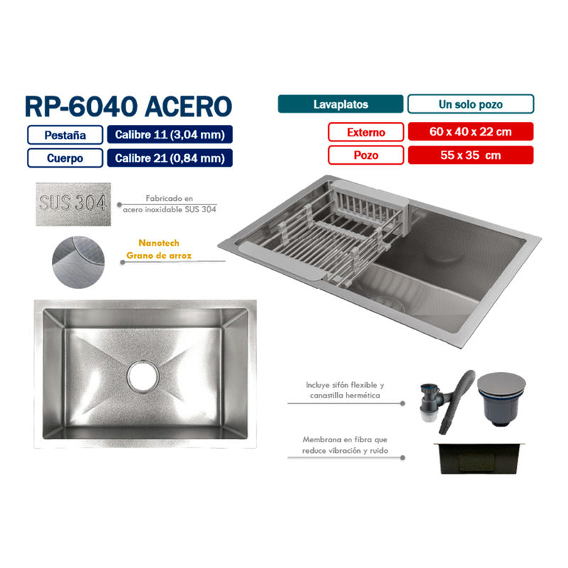 Lavaplatos Acero Acero Plateado 70*45cm + Accesorios