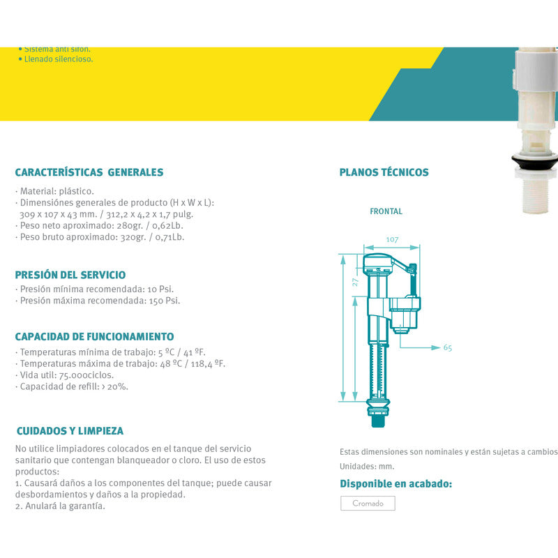 Válvula Sanitario Llenado Universal Plus SKU:O22850001 PREGUNTAS FRECUENTES ¿GENERAN FACTURA? Sí, emitimos facturas legales con IVA incluido. Somos un régimen común y realizamos facturación electrónica. ¿MANEJAN VARIEDAD DE TONOS? Sí, manejamos una amplia gama de colores, como bronce y cobre antiguo, para personalizar tus griferías y accesorios. Realizamos acabados de aspecto antiguo en griferías nuevas o usadas. Transformamos tus griferías para darles un toque clásico y elegante. ¿SON FABRICANTES? Sí, somos fabricantes de tus ideas. Fabricamos hermosas griferías y accesorios de excelente calidad para embellecer tus espacios de la mejor manera. En GRIFOS CENTER, convertimos tus ideas en realidad. Fabricamos griferías VINTAGE y ofrecemos diversos estilos de acabados antiguos para tus griferías y accesorios. Además, proporcionamos una amplia variedad de productos de alta calidad para el hogar y productos institucionales para tus proyectos. ¿GENERAN FACTURA LEGAL Y ELECTRÓNICA? Sí, generamos factura legal con IVA incluido y ofrecemos facturación electrónica. ¿MI COMPRA TIENE GARANTÍA? Todos nuestros productos son nuevos y cuentan con garantía oficial de 1 año. Se entregan en sus empaques o cajas originales. ¿TIENEN PUNTO DE VENTA? Sí, somos GRIFOS CENTER y tenemos un punto de venta físico donde puedes recoger tus productos directamente si lo deseas. ¿DÓNDE ESTÁN UBICADOS? Nos encontramos en el Norte de Bogotá. Tenemos un amplio stock de nuestros productos para envío inmediato. Además, ofrecemos la opción de recoger tus compras en nuestro punto de venta. ¿MANEJAN PRODUCTOS PARA PROYECTOS? Sí, ofrecemos una amplia variedad de productos y contamos con un extenso inventario para atender proyectos grandes, como constructoras, hoteles, colegios y grandes superficies. ¿OFRECEN PRODUCTOS AL POR MAYOR? Sí, contamos con un extenso inventario y una gran variedad de productos para atender tus solicitudes. ¿HACEN ENVÍOS A NIVEL NACIONAL? Sí, GRIFOS CENTER realiza envíos a nivel nacional. ¿SE PUEDEN RETIRAR LOS PRODUCTOS EN EL PUNTO DE VENTA? Ofrecemos la opción de retirar productos en nuestro punto de venta o de enviarlos por otra transportadora, seleccionando "recojo en el domicilio del vendedor". En este caso, el comprador se encarga del costo del envío. NOTA IMPORTANTE: Los logos en la publicación son marcas de agua y el producto te llegará sin este logo. ----------------------SOMOS IMPORTADORES CON MARCA PROPIA-----------------------