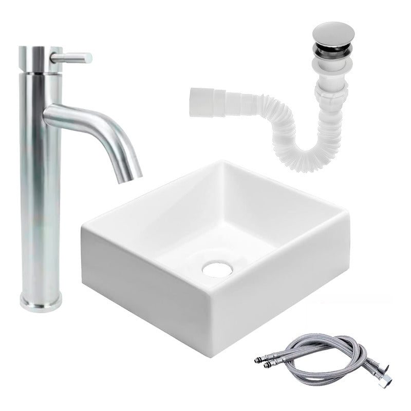 Kit Lavamanos Cuadrado+grifo Monocontrol Satinada Curva+push