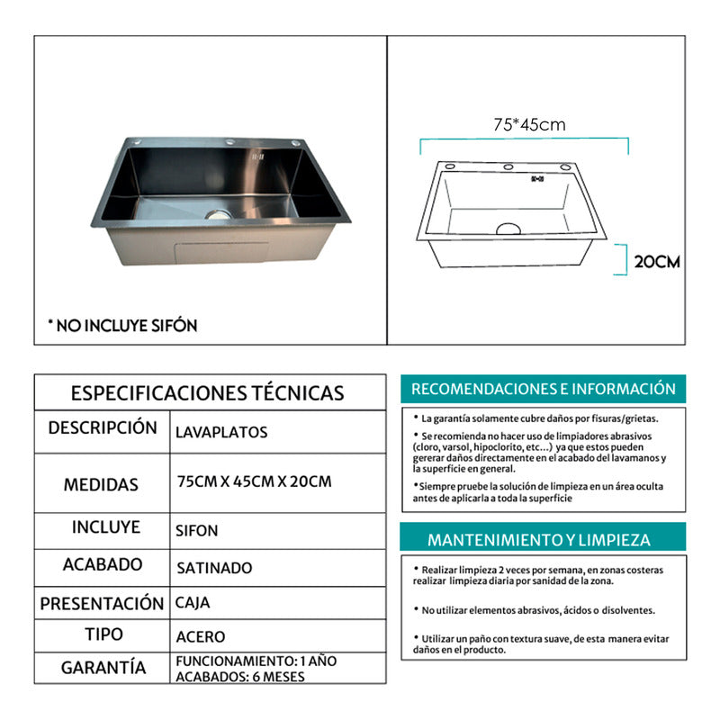 Lavaplatos en Acero 75*45*20cm Negro+Accesorios SKU: 7545B PREGUNTAS FRECUENTES ¿GENERAN FACTURA? Sí, emitimos facturas legales con IVA incluido. Somos un régimen común y realizamos facturación electrónica. ¿MANEJAN VARIEDAD DE TONOS? Sí, manejamos una amplia gama de colores, como bronce y cobre antiguo, para personalizar tus griferías y accesorios. Realizamos acabados de aspecto antiguo en griferías nuevas o usadas. Transformamos tus griferías para darles un toque clásico y elegante. ¿SON FABRICANTES? Sí, somos fabricantes de tus ideas. Fabricamos hermosas griferías y accesorios de excelente calidad para embellecer tus espacios de la mejor manera. En GRIFOS CENTER, convertimos tus ideas en realidad. Fabricamos griferías VINTAGE y ofrecemos diversos estilos de acabados antiguos para tus griferías y accesorios. Además, proporcionamos una amplia variedad de productos de alta calidad para el hogar y productos institucionales para tus proyectos. ¿GENERAN FACTURA LEGAL Y ELECTRÓNICA? Sí, generamos factura legal con IVA incluido y ofrecemos facturación electrónica. ¿MI COMPRA TIENE GARANTÍA? Todos nuestros productos son nuevos y cuentan con garantía oficial de 1 año. Se entregan en sus empaques o cajas originales. ¿TIENEN PUNTO DE VENTA? Sí, somos GRIFOS CENTER y tenemos un punto de venta físico donde puedes recoger tus productos directamente si lo deseas. ¿DÓNDE ESTÁN UBICADOS? Nos encontramos en el Norte de Bogotá. Tenemos un amplio stock de nuestros productos para envío inmediato. Además, ofrecemos la opción de recoger tus compras en nuestro punto de venta. ¿MANEJAN PRODUCTOS PARA PROYECTOS? Sí, ofrecemos una amplia variedad de productos y contamos con un extenso inventario para atender proyectos grandes, como constructoras, hoteles, colegios y grandes superficies. ¿OFRECEN PRODUCTOS AL POR MAYOR? Sí, contamos con un extenso inventario y una gran variedad de productos para atender tus solicitudes. ¿HACEN ENVÍOS A NIVEL NACIONAL? Sí, GRIFOS CENTER realiza envíos a nivel nacional. ¿SE PUEDEN RETIRAR LOS PRODUCTOS EN EL PUNTO DE VENTA? Ofrecemos la opción de retirar productos en nuestro punto de venta o de enviarlos por otra transportadora, seleccionando "recojo en el domicilio del vendedor". En este caso, el comprador se encarga del costo del envío. NOTA IMPORTANTE: Los logos en la publicación son marcas de agua y el producto te llegará sin este logo. ----------------------SOMOS IMPORTADORES CON MARCA PROPIA-----------------------
