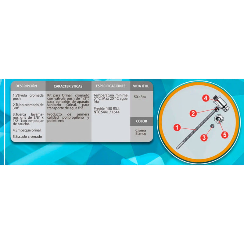 -Medidas:37 cm de alto x 1/2 pulgada de diámetro, aproximadamente -Características Reparaciones wc, tipo válvula regulación, rígida, en material de alta resistencia, economizadora de agua, con sistema coflex, --fácil de instalar. -Material Plástico -Uso Orinales -Diámetro salida 1/2 pulgada (1,27 cm) -Diámetro en pulgadas 1/2 pulg -Incluye Válvula de regulación, escudo de 1/2 pulgada, acometida de 1/2 pulgada, acoflex tubo de 3/8 de pulgada -Acabado: Cromada