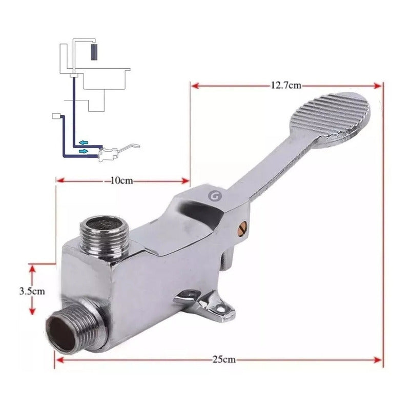 Valvula De Pedal Institucional Caracteristicas: •Superficie libre de defectos o ralladuras. •Producto probado para resistir oxidación o corrosión. •Funcionamiento adecuado desde 20 hasta 125 PSI. •Sistema de cierre probado hasta los 500.000 ciclos, sin presentar fugas. •Material: cuerpo de bronce, brazo en acero inoxidable •Instalacion: 1/2 al piso •Sistema de cierre Automático. •Incluye chazos expansivos para instalar al piso. •Recomendado para uso de fregaderos de cocina, lavamanos o en lavanderías. •Exigido por asociacion sanitaria •Venta factura régimen común SE REALIZA ACABADO (ANTIGUO) A TODA CLASE DE GRIFERÍAS NUEVAS Y USADAS