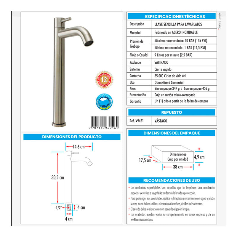 Griferia Lavamanos Agua Fría Poste Alto Metálica Acero Producto totalmente metálico con acabado en color acero de alta calidad, usado lavamanos de mueble sobre puesto o sobre poner. •Funcionamiento: Mover manija horizontal. •Medidas: Altura 30,5 cm, salida de chorro 9 cm y manija de control 6 cm . •Material: Producto totalmente metálico. •Presión: presión 80psi •Instalación: Producto fácil de instalar , solo debes incrustar el grifo el hueco del mesón o mueble y ajustar con la tuerca en la parte inferior. •Incluye: Griferia poste alto lavamanos(no incluye acople). •Recomendaciones. A la hora de instalar no usar herramientas, hacer ajuste manualmente. •VENTA FACTURA RÉGIMEN COMÚN. •También contamos con variedad de tonos entre ellos, Cobre antiguo, Dorados, Satinados, Cobre níquel, Negro, Cromados entre otros. Realizamos el acabado en el tono que desee. ¡Somos fabricantes de sus ideas! --------------------------------------------------------------------------------------------------------------------------------------. ¿Generan factura legal? Si. Generamos facturas legales con IVA incluido. Somos régimen común. ¿Mi compra tiene garantía? Si. Todos nuestros productos son nuevos y cuentan con garantía oficial. ¿Tiene bodega propia? En GRIFOS CENTER sabemos la importancia de recibir tu producto a tiempo, por eso contamos con bodega propia e inventario actualizado al instante, para que podamos gestionar tu pedido y despacharlo lo antes posible. ¿Están en Bogotá? Si. Y podemos entregarte el mismo día según el producto que compres. • Si es un producto de tonos Anticados (envejecidos) la entrega es de 1 hasta 8 días según el producto o si es de fabricación. • Puedes recoger en nuestro punto de venta. • Podemos enviar un servicio de envió express a tu domicilio, que en 1 o 5 horas deja el paquete en tu hogar. Este servicio tiene un valor muy económico extra liquidado en el momento de la compra.