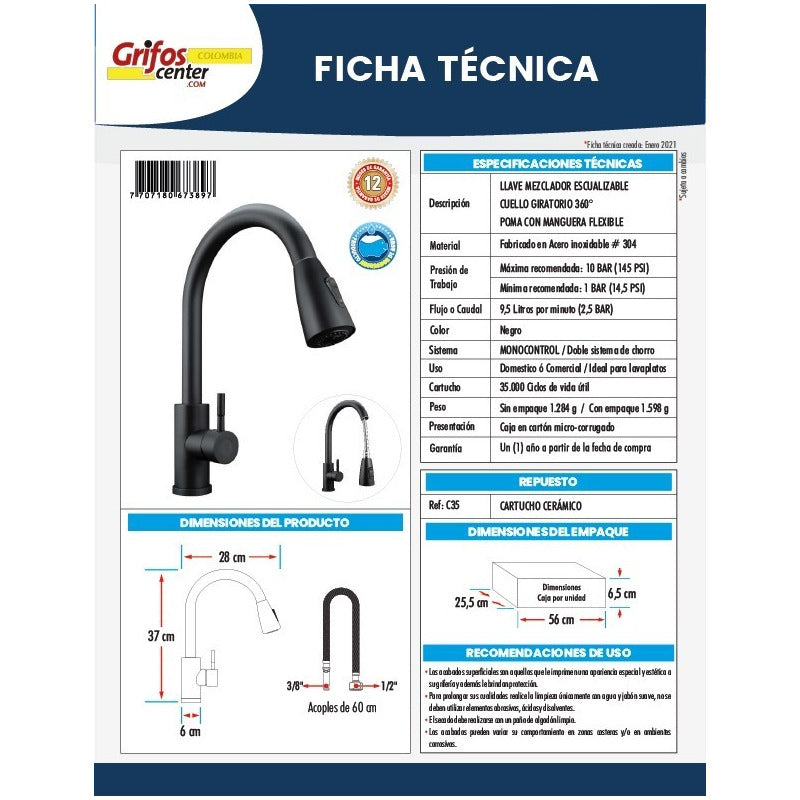 Materiales Metal de alta calidad Diseño: Elegante y funcional Lugar de colocación De mesada Cantidad de agujeros 1 Aireador Sí Filtro de agua Sí Mezclador Sí Altura 44 cm Descripción GRIFERIA LAVAPLATOS MONOCONTROL EXTRAIBLE ACERO INOXIDABLE NEGRO • Griferia para cocina industrial o cocina con lavaplatos grande, con cabezal móvil permite un lavado de fácil debido a su manguera flexible. • Sistema: Cabezal móvil reportado que permite el alto tráfico. • Medidas: En altura 44cm . salida 22 cm con tango adicional hasta de 60 cm por el cabezal móvil. • Color NEGRO acero • Elaborado con cuerpo interno de bronce recubrimiento en acero y cabezal en ABS NEGRO • Contiene una grifería un herraje de ajuste y dos acoples flexo-metálicos. • Recomendación: Instalar de formar manual, un usar herramientas de ajuste sobre el cromado, al igual en las mangueras MARCA: GRIFOS CENTER Somos importadores directos! Garantía : 12 meses Venta factura régimen común. -También contamos con variedad de tonos entre ellos, cobre antiguo. Dorados satinados, cromados entre otros. - Somos fabricantes de sus ideas. -SE REALIZA ACABADO (ANTIGUO) A TODA CLASE DE GRIFERIAS NUEVAS O USADAS. ------------------------------------ ¿Generan factura legal? Si. Generamos facturas legales con IVA incluido. Somos régimen común. ¿Mi compra tiene garantía? Si. Todos nuestros productos son nuevos y cuentan con garantía oficial. Se entregan en sus empaques o cajas originales. ¿Tiene punto de venta? Si. Somos GRIFOS CENTER y tenemos nuestro punto de venta, puedes recoger tus productos directamente si deseas. ¿Dónde están ubicados? Estamos en Bogotá podemos entregarte el mismo día dependiendo el producto y cantidad. • Puedes recoger en nuestro punto de venta. • Podemos enviar un servicio de envió express a tu domicilio, que en 1 o 3 horas deja el paquete en tu hogar. Este servicio tiene un valor muy económico extra liquidado en el momento de la compra.