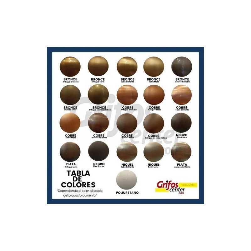 Griferia lavamanos agua fria Monocontrol bronce Marca: Grifos center Diseño: Elegante y funcional Sistema: monocontrol agua fria Acabado: cromo brillante Material: bronce Garantía: 12 meses Uso: lavamanos con portagrifo o de bajoponer o submontar. -venta factura régimen común. -también contamos con variedad de tonos entre ellos, cobre antiguo. dorados satinados, cromados entre otros. - somos fabricantes de sus ideas. ------------------------------------------------------------------------------ ¿Generan factura legal? Si. Generamos facturas legales con IVA incluido. Somos régimen común. ¿Mi compra tiene garantía? Si. Todos nuestros productos son nuevos y cuentan con garantía oficial. Se entregan en sus empaques o cajas originales. ¿Tiene punto de venta? Si. Somos GRIFOS CENTER y tenemos nuestro punto de venta, puedes recoger tus productos directamente si deseas. ¿Dónde están ubicados? Estamos en Bogotá podemos entregarte el mismo día dependiendo el producto y cantidad. • Puedes recoger en nuestro punto de venta. • Podemos enviar un servicio de envió express a tu domicilio, que en 1 o 3 horas deja el paquete en tu hogar. Este servicio tiene un valor muy económico extra liquidado en el momento de la compra.