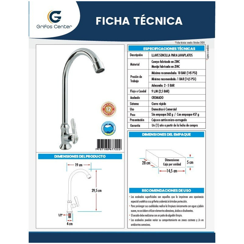 Llave sencilla para lavaplatos tipo Arcco Marca: GRIFOS CENTER. Material: De alta calidad. Diseño: Elegante y funcional. Venta factura régimen común. Somos fabricantes de sus ideas. -------------ENTREGA DEL PRODUCTO ENTRE 1 A 2 DIAS EN CIUDADES PRINCIPALES Y DE NO SER ASI DE 2 A 3 DIAS HABILES ---------------------------------- ¿Generan factura legal? Si. generamos facturas legales con iva incluido. Somos régimen común. ¿Mi compra tiene garantía? Si. todos nuestros productos son nuevos y cuentan con garantía oficial. Se entregan en sus empaques o cajas originales. ¿Tiene punto de venta? SI, SOMOS GRIFOS CENTER y tenemos nuestro punto de venta, puedes recoger tus productos directamente si deseas. ¿Dónde están ubicados? Estamos en Bogotá podemos entregarte el mismo día dependiendo el producto y cantidad. • puedes recoger en nuestro punto de venta.