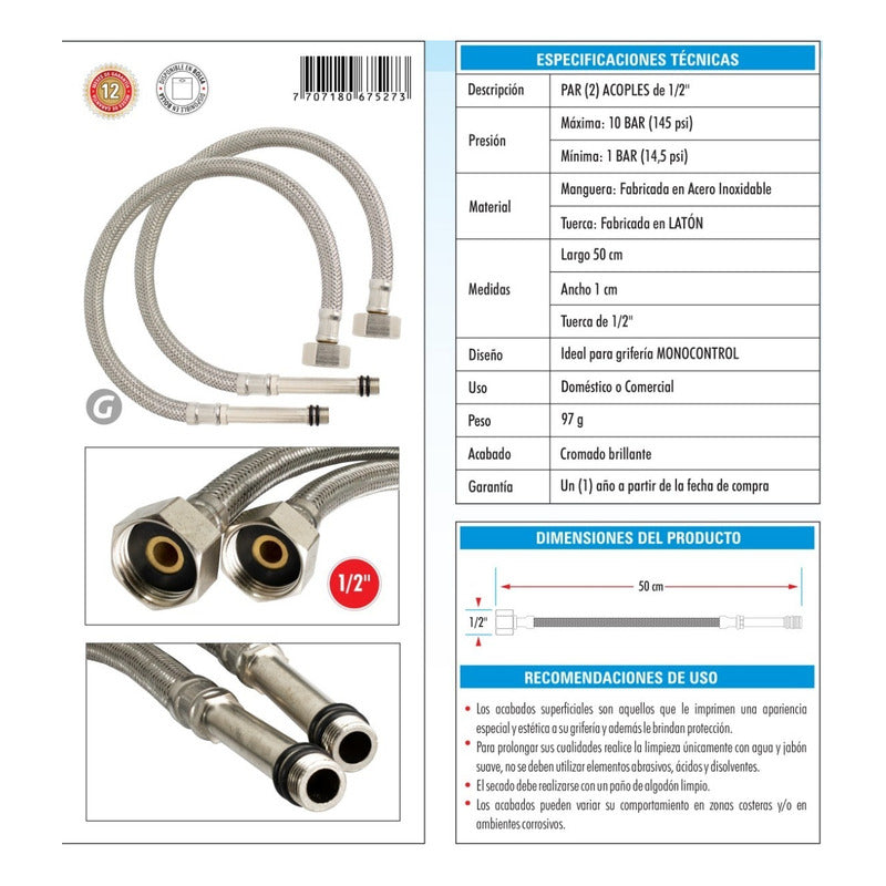 Mangueras de acople con extensión para monocontrol Marca: GRIFOS CENTER. Rosca de 1/2*1/2 Largo: 50 centimetros Un par de acoples (Dos unidades) Material: De alta calidad. Diseño: Elegante y funcional. Venta factura régimen común. Somos fabricantes de sus ideas. -------------ENTREGA DEL PRODUCTO ENTRE 1 A 2 DIAS EN CIUDADES PRINCIPALES Y DE NO SER ASI DE 2 A 3 DIAS HABILES ---------------------------------- ¿Generan factura legal? Si. generamos facturas legales con iva incluido. Somos régimen común. ¿Mi compra tiene garantía? Si. todos nuestros productos son nuevos y cuentan con garantía oficial. Se entregan en sus empaques o cajas originales. ¿Tiene punto de venta? SI, SOMOS GRIFOS CENTER y tenemos nuestro punto de venta, puedes recoger tus productos directamente si deseas. ¿Dónde están ubicados? Estamos en Bogotá podemos entregarte el mismo día dependiendo el producto y cantidad. • puedes recoger en nuestro punto de venta.