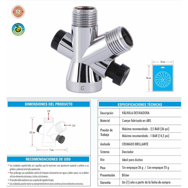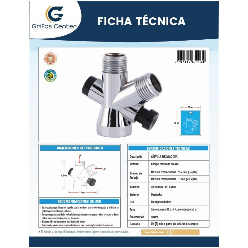 Valvila desviadora de 1/2 Marca: GRIFOS CENTER. Material: De alta calidad. Diseño: Elegante y funcional. Venta factura régimen común. Somos fabricantes de sus ideas. -------------ENTREGA DEL PRODUCTO ENTRE 1 A 2 DIAS EN CIUDADES PRINCIPALES Y DE NO SER ASI DE 2 A 3 DIAS HABILES ---------------------------------- ¿Generan factura legal? Si. generamos facturas legales con iva incluido. Somos régimen común. ¿Mi compra tiene garantía? Si. todos nuestros productos son nuevos y cuentan con garantía oficial. Se entregan en sus empaques o cajas originales. ¿Tiene punto de venta? SI, SOMOS GRIFOS CENTER y tenemos nuestro punto de venta, puedes recoger tus productos directamente si deseas. ¿Dónde están ubicados? Estamos en Bogotá podemos entregarte el mismo día dependiendo el producto y cantidad. • puedes recoger en nuestro punto de venta.