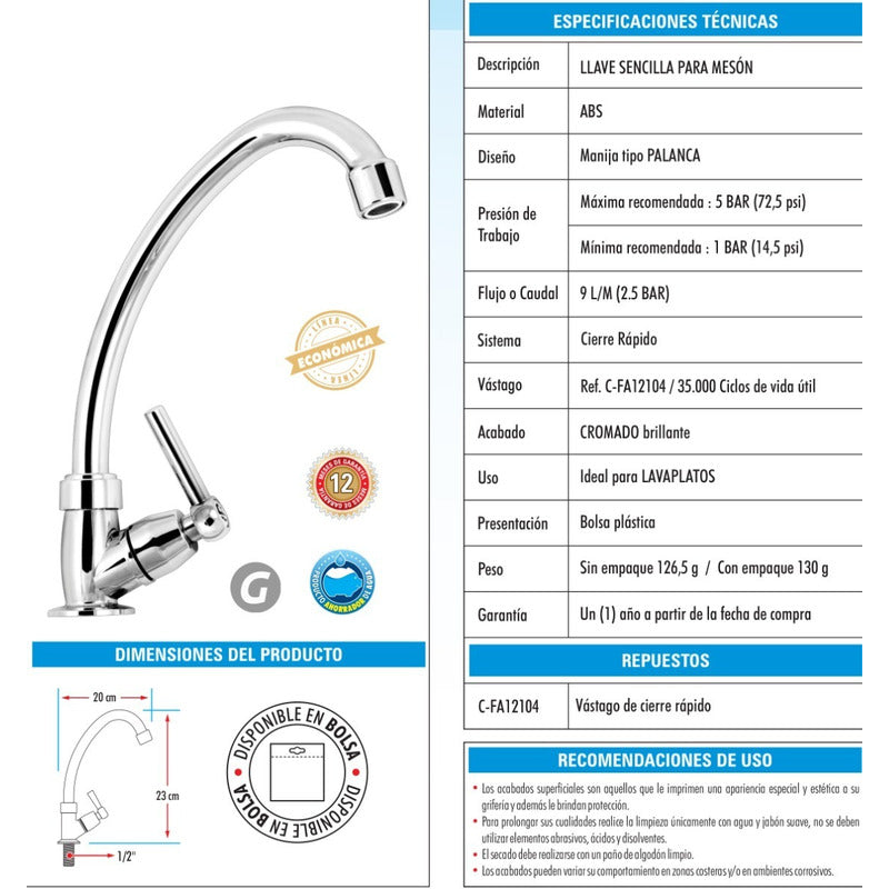Griferia Sencilla Lavaplatos Cromada Tipo Palanca