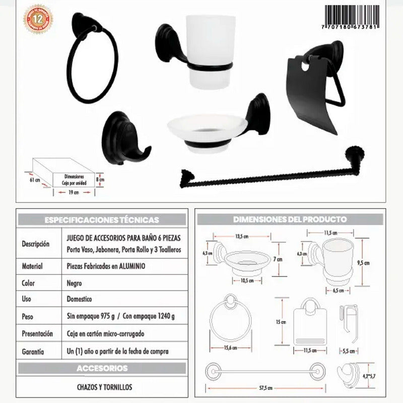 Set Accesoriosx7 Para Baño Negro Mate 6