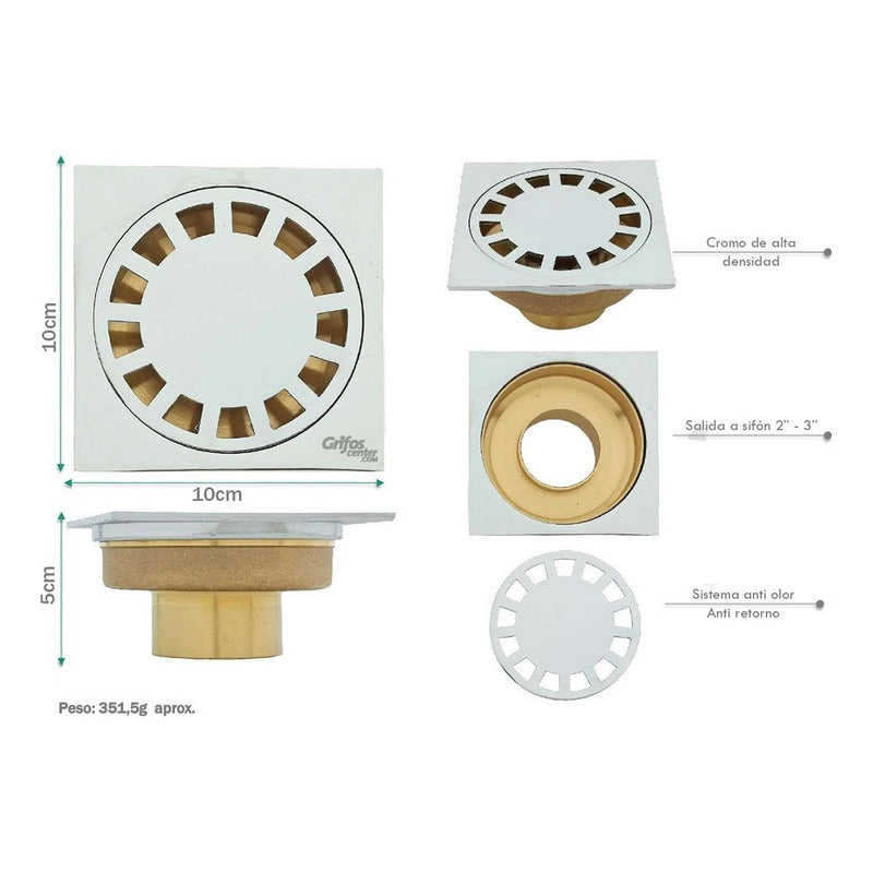Rejilla Cuadrada en Zamak + Sifón en Bronce Medidas: -10 x 10 x 5 cm -Cromo de alta densidad -Sistema anti olor -Seguro de tapa con giro -Anti retorno Peso: 218,5g aprox. -Hecho de materiales de acero inoxidable, mayor duración de la vida útil. Con funciones de descarga de agua y a prueba de insectos, fácil de limpiar y de usar. -Protege la cocina, el baño, el garaje y el baño de olores desagradables, insectos o ratones. - Marca: GRIFOS CENTER ENVÍO GRATIS -Venta factura régimen común. -También contamos con variedad de tonos entre ellos cromo, dorado, negro. -Somos fabricantes de sus ideas. -------------ENTREGA DEL PRODUCTO ENTRE 1 A 2 DIAS EN CIUDADES PRINCIPALES Y DE NO SER ASI DE 2 A 3 DIAS HABILES ---------------------------------- -SOMOS FABRICANTES EN GRIFERIA VITAGE- SE REALIZA ACABADO (ANTIGUO) A TODA CLASE DE GRIFERIAS NUEVAS O USADAS. ¿Generan factura legal? Si. Generamos facturas legales con IVA incluido. Somos régimen común. ¿Mi compra tiene garantía? Si. Todos nuestros productos son nuevos y cuentan con garantía oficial. Se entregan en sus empaques o cajas originales. ¿Tiene punto de venta? SI, somos GRIFOS CENTER y tenemos nuestro punto de venta, puedes recoger tus productos directamente si deseas. • Puedes recoger en nuestro punto de venta •