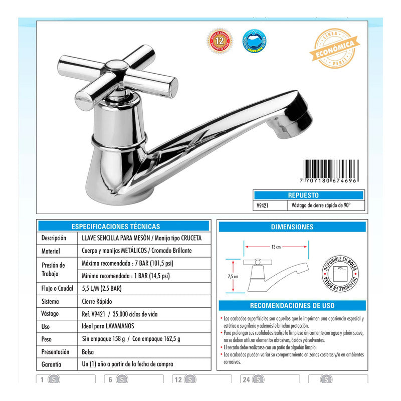 LLAVE LAVAMANOS SENCILLA TIPO CRUCETA Cuerpo y manijas / Cromado Brillante Presión de trabajo: Máxima recomendada : 7 BAR (101,5 psi) - Mínima recomendada : 1 BAR (14,5 psi) Flujo: 5,5 L/M (2.5 BAR) Sistema: Cierre Rápido Ideal para LAVAMANOS -Los acabados superficiales son aquellos que le imprimen una apariencia especial y estética a su grifería y además le brindan protección. -Para prolongar sus cualidades realice la limpieza únicamente con agua y jabón suave, no se deben utilizar elementos abrasivos, ácidos y disolventes. -El secado debe realizarse con un paño de algodón limpio. -Los acabados pueden variar su comportamiento en zonas costeras y/o en ambientes corrosivos. -------------ENTREGA DEL PRODUCTO ENTRE 1 A 2 DIAS EN CIUDADES PRINCIPALES Y DE NO SER ASI DE 2 A 3 DIAS HABILES ---------------------------------- -SE REALIZA ACABADO (ANTIGUO) A TODA CLASE DE GRIFERIAS NUEVAS O USADAS. _________ ¿Generan factura legal? Si. generamos facturas legales con iva incluido. Somos régimen común. ¿Mi compra tiene garantía? Si. todos nuestros productos son nuevos y cuentan con garantía oficial. Se entregan en sus empaques o cajas originales. ¿Tiene punto de venta? SOMOS GRIFOS CENTER y tenemos nuestro punto de venta, puedes recoger tus productos directamente si deseas. ¿Dónde están ubicados? GRIFOS CENTER esta ubicado en Bogotá podemos entregarte el mismo día dependiendo el producto y cantidad. •puedes recoger en nuestro punto de venta. ¿ Son fabricantes? - Si, GRIFOS CENTER es fabricante directo de las griferias vintage y de los diferentes acabados (tonos) que ofrecemos. ¿ Tienen buen inventario para proyectos grandes como lo son las constructoras , hoteles , colegios ? - Si, GRIFOS CENTER Cuenta con buen inventario y variedad de productos para atender proyectos grandes ? ¿ Hacen envíos a nivel nacional? - Si GRIFOS CENTER realiza envíos a nivel nacional.