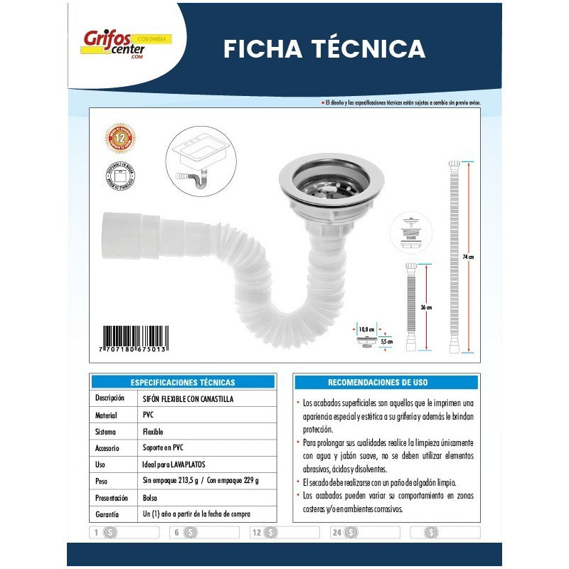 SIFÓN FLEXIBLE CON CANASTILLA Material: PVC Sistema: Flexible Accesorios: Soporte en PVC Uso: Ideal para LAVAPLATOS RECOMENDACIONES -Los acabados superficiales son aquellos que le imprimen una apariencia especial y estética a su grifería y además le brindan protección. -Para prolongar sus cualidades realice la limpieza únicamente con agua y jabón suave, no se deben utilizar elementos abrasivos, ácidos y disolventes. -El secado debe realizarse con un paño de algodón limpio. Los acabados pueden variar su comportamiento en zonas costeras y/o en ambientes corrosivos. -------------ENTREGA DEL PRODUCTO ENTRE 1 A 2 DIAS EN CIUDADES PRINCIPALES Y DE NO SER ASI DE 2 A 3 DIAS HABILES ---------------------------------- -SE REALIZA ACABADO (ANTIGUO) A TODA CLASE DE GRIFERIAS NUEVAS O USADAS. _________ ¿Generan factura legal? Si. generamos facturas legales con iva incluido. Somos régimen común. ¿Mi compra tiene garantía? Si. todos nuestros productos son nuevos y cuentan con garantía oficial. Se entregan en sus empaques o cajas originales. ¿Tiene punto de venta? SOMOS GRIFOS CENTER y tenemos nuestro punto de venta, puedes recoger tus productos directamente si deseas. ¿Dónde están ubicados? GRIFOS CENTER esta ubicado en Bogotá podemos entregarte el mismo día dependiendo el producto y cantidad. •puedes recoger en nuestro punto de venta. ¿ Son fabricantes? - Si, GRIFOS CENTER es fabricante directo de las griferías vintage y de los diferentes acabados (tonos) que ofrecemos. ¿ Tienen buen inventario para proyectos grandes como lo son las constructoras , hoteles , colegios ? - Si, GRIFOS CENTER Cuenta con buen inventario y variedad de productos para atender proyectos grandes ¿ Hacen envíos a nivel nacional? - Si GRIFOS CENTER realiza envíos a nivel nacional.
