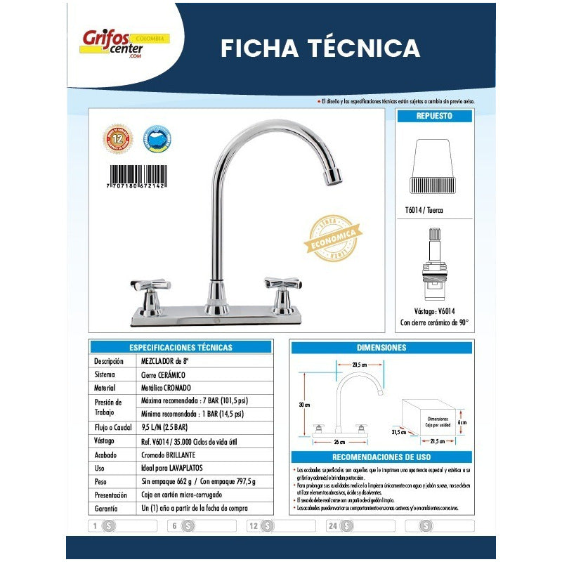 SKU: 6014 BOCH LLAVE MEZCLADOR DE 8 PARA LAVAPLATOS CUERPO METALICO MANIJA TIPO CRUCETA SISTEMA CON CIERRE CERAMICO ACABADO CROMADO BRILLANTE -MEZCLADOR de 8" -Sistema: Cierre CERÁMICO -Material: Metálico CROMADO -Presión de trabajo: Máxima recomendada : 7 BAR (101,5 psi)- Mínima recomendada : 1 BAR (14,5 psi) -Flujo: 9,5 L/M (2.5 BAR) Ideal para LAVAPLATOS RECOMENDACIONES DE USO -Los acabados superficiales son aquellos que le imprimen una apariencia especial y estética a su grifería y además le brindan protección. -Para prolongar sus cualidades realice la limpieza únicamente con agua y jabón suave, no se deben utilizar elementos abrasivos, ácidos y disolventes. -El secado debe realizarse con un paño de algodón limpio. -Los acabados pueden variar su comportamiento en zonas costeras y/o en ambientes corrosivos. -Venta factura régimen común. -También contamos con variedad de tonos. -Somos fabricantes de sus ideas. -------------ENTREGA DEL PRODUCTO ENTRE 1 A 2 DIAS EN CIUDADES PRINCIPALES Y DE NO SER ASI DE 2 A 3 DIAS HABILES ---------------------------------- -SOMOS FABRICANTES EN GRIFERIAS, LAVAMANOS Y ACCESORIOS VITAGE- SE REALIZA ACABADO (ANTIGUO) A TODA CLASE DE GRIFERIAS NUEVAS O USADAS. ¿Generan factura legal Electrónica? Si. Generamos facturas legal electrónica con IVA incluido. Somos régimen común. ¿Mi compra tiene garantía? Si. Todos nuestros productos son nuevos y cuentan con garantía oficial. Se entregan en sus empaques o cajas originales. ¿Tiene punto de venta? SI, somos GRIFOS CENTER y tenemos nuestro punto de venta, puedes recoger tus productos directamente si deseas, o enviar por otra transportadora colocando recojo en el domicilio del vendedor, en este último el comprador cancela el envío cuando llegue el producto ¿Dónde están ubicados? No solo somos tienda online, también tenemos tienda física con un amplio Stock de nuestros productos para envío inmediato, GRIFOS CENTER esta ubicado en el Norte de Bogotá podemos entregarte el mismo día dependiendo el producto y cantidad. •Recuerda que somos GRIFOS CENTER para mayor información ¿ Son fabricantes? - Si, GRIFOS CENTER es fabricante directo de griferías, lavamanos y accesorios VINTAGE (fabricando tus ideas y ofreciendo diferentes estilos de acabados para tu grifería). Además, brindamos una amplia variedad de productos para todos tus proyectos de construcción y remodelación tanto institucionales, diseños de lujo y línea para el hogar, garantizándote acabados de la mejor calidad. ¿Ofrecen productos al por mayor? - Si, en GRIFOS CENTER contamos con un amplio inventario y variedad de productos para atender proyectos grandes como lo son las constructoras, hoteles, colegios y grandes superficies. ¿ Hacen envíos a nivel nacional? - Si GRIFOS CENTER realiza envíos a nivel nacional. ¿Qué garantías manejan? -Según la referencia comprada generalmente tiene garantía de 1 año donde nos podrás informar cualquier inconveniente NOTA: Los logos en la publicación son marcas de agua el producto te llegara sin este logo -----------------SOMOS IMPORTADORES Y FABRICANTES CON MARCA PROPIA------------