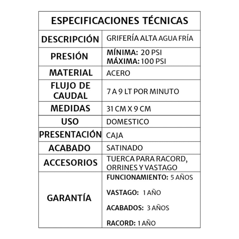 Griferia Lavamanos Agua Fría Alta Acero Tipo Vessel