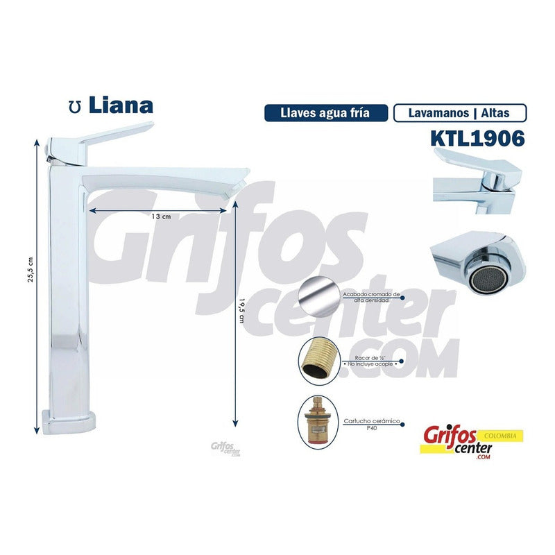 GRIFERIA LAVAMANOS ALTA AGUA FRIA LIANA SKU:KTL1906 -Acabado cromado de alta densidad -Racor de ½"• No incluye acople • -Cartucho cerámico -Venta factura régimen común. -También contamos con variedad de tonos. -Somos fabricantes de sus ideas. -------------ENTREGA DEL PRODUCTO ENTRE 1 A 2 DÍAS EN CIUDADES PRINCIPALES Y DE NO SER ASÍ DE 2 A 3 DÍAS HÁBILES ---------------------------------- -SE REALIZA ACABADO (ANTIGUO) A TODA CLASE DE GRIFERÍAS NUEVAS O USADAS. ___ ¿Generan factura legal y electrónica? Si. generamos factura legal con IVA , somos régimen común y realizamos facturación electrónica. ¿Mi compra tiene garantía? Si. todos nuestros productos son nuevos y cuentan con garantía oficial. Se entregan en sus empaques o cajas. ¿Tiene punto de venta? Somos GRIFOS CENTER y tenemos nuestro punto de venta, puedes recoger tus productos directamente si deseas. ¿Dónde están ubicados? GRIFOS CENTER esta ubicado en el Norte de Bogotá podemos entregarte el mismo día dependiendo el producto y cantidad. •Recuerda que somos GRIFOS CENTER para mayor información •Puedes recoger en nuestro punto de venta. ¿ Son fabricantes? - Si, GRIFOS CENTER es fabricante directo de griferÍas VINTAGE (fabricando tus ideas y ofreciendo diferentes estilos de acabados para tu grifería). Además brindamos una amplia variedad de productos institucionales y para el hogar con la mejor calidad. ¿Ofrecen productos al por mayor? - Si, en GRIFOS CENTER contamos con un amplio inventario y variedad de productos para atender proyectos grandes como lo son las constructoras , hoteles , colegios y grandes superficies. ¿ Hacen envíos a nivel nacional? - Si GRIFOS CENTER realiza envíos a nivel nacional. ----------------------SOMOS IMPORTADORES CON MARCA PROPIA---------------------------