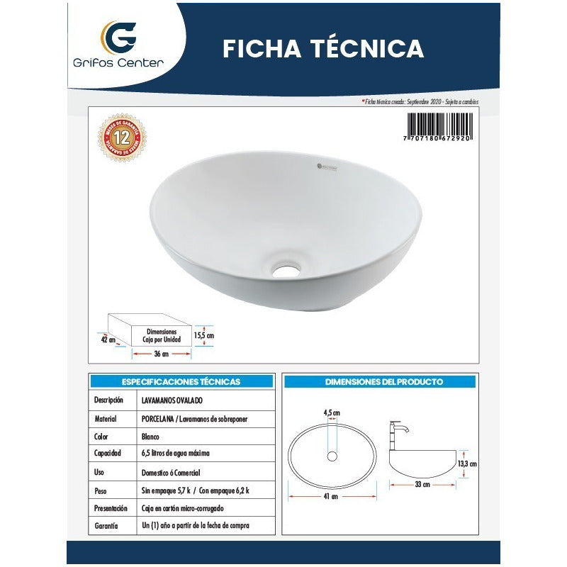 Lavamanos En Pocelana Ovalado