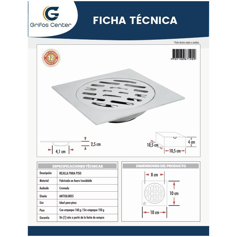 REJILLA PARA PISO EN ACERO INOXIDABLE, TAMAÑO 10CM X 10CM -Fabricada en acero inoxidable -Antiolores -Venta factura régimen común. -También contamos con variedad de tonos. -Somos fabricantes de sus ideas. ----SE REALIZA ACABADO (ANTIGUO) A TODA CLASE DE GRIFERÍAS NUEVAS O USADAS----- ¿Generan factura legal y electrónica? Si. generamos factura legal con IVA , somos régimen común y realizamos facturación electrónica. ¿Mi compra tiene garantía? Si. todos nuestros productos son nuevos y cuentan con garantía oficial. Se entregan en sus empaques o cajas. ¿Tiene punto de venta? Somos GRIFOS CENTER y tenemos nuestro punto de venta, puedes recoger tus productos directamente si deseas. ¿Dónde están ubicados? No solo somos tienda online, también tenemos tienda física con un amplio Stock de nuestros productos para envío inmediato, GRIFOS CENTER esta ubicado en el Norte de Bogotá podemos entregarte el mismo día dependiendo el producto y cantidad. •Recuerda que somos GRIFOS CENTER para mayor información •Puedes recoger en nuestro punto de venta. ¿ Son fabricantes? - Si, GRIFOS CENTER es fabricante directo de griferÍas VINTAGE (fabricando tus ideas y ofreciendo diferentes estilos de acabados para tu grifería). Además brindamos una amplia variedad de productos institucionales y para el hogar con la mejor calidad. ¿Ofrecen productos al por mayor? - Si, en GRIFOS CENTER contamos con un amplio inventario y variedad de productos para atender proyectos grandes como lo son las constructoras , hoteles , colegios y grandes superficies. ¿ Hacen envíos a nivel nacional? - Si GRIFOS CENTER realiza envíos a nivel nacional. ¿Se pueden retirar los productos en el punto de venta? Tenemos la posibilidad de retirar el producto en nuestro punto de venta o enviar por otra transportadora colocando recojo en el domicilio del vendedor este ultimo el comprador cancela el envio cuando llegue el producto. ¿Qué garantías manejan? -Según la referencia comprada generalmente tiene garantía de 1 año donde nos podrás informar cualquier inconveniente ----------------------SOMOS IMPORTADORES CON MARCA PROPIA---------------------------