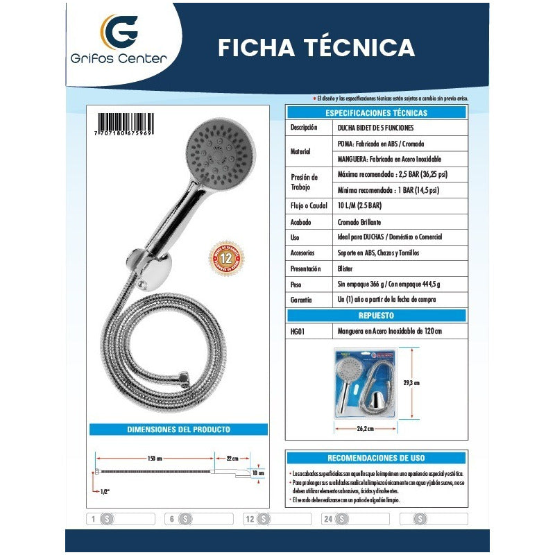 TELEDUCHA CON MANGUERA DE 1.5M 5 FUNCIONES REGADERA Y SOPORTE EN ABS MANGUERA EN ACERO INOXIDABLE ACABADO CROMADO BRILLANTE -Material: POMA: Fabricada en ABS / Cromada MANGUERA: Fabricada en Acero Inoxidable -Acabado cromado brillante Los acabados superficiales son aquellos que le imprimen una apariencia especial y estética. Para prolongar sus cualidades realice la limpieza únicamente con agua y jabón suave, no se deben utilizar elementos abrasivos, ácidos y disolventes. El secado debe realizarse con un paño de algodón limpio. -Venta factura régimen común. -También contamos con variedad de tonos. -Somos fabricantes de sus ideas. ----SE REALIZA ACABADO (ANTIGUO) A TODA CLASE DE GRIFERÍAS NUEVAS O USADAS----- ¿Generan factura legal y electrónica? Si. generamos factura legal con IVA , somos régimen común y realizamos facturación electrónica. ¿Mi compra tiene garantía? Si. todos nuestros productos son nuevos y cuentan con garantía oficial. Se entregan en sus empaques o cajas. ¿Tiene punto de venta? Somos GRIFOS CENTER y tenemos nuestro punto de venta, puedes recoger tus productos directamente si deseas. ¿Dónde están ubicados? No solo somos tienda online, también tenemos tienda física con un amplio Stock de nuestros productos para envío inmediato, GRIFOS CENTER esta ubicado en el Norte de Bogotá podemos entregarte el mismo día dependiendo el producto y cantidad. •Recuerda que somos GRIFOS CENTER para mayor información •Puedes recoger en nuestro punto de venta. ¿ Son fabricantes? - Si, GRIFOS CENTER es fabricante directo de griferÍas VINTAGE (fabricando tus ideas y ofreciendo diferentes estilos de acabados para tu grifería). Además brindamos una amplia variedad de productos institucionales y para el hogar con la mejor calidad. ¿Ofrecen productos al por mayor? - Si, en GRIFOS CENTER contamos con un amplio inventario y variedad de productos para atender proyectos grandes como lo son las constructoras , hoteles , colegios y grandes superficies. ¿ Hacen envíos a nivel nacional? - Si GRIFOS CENTER realiza envíos a nivel nacional. ¿Se pueden retirar los productos en el punto de venta? Tenemos la posibilidad de retirar el producto en nuestro punto de venta o enviar por otra transportadora colocando recojo en el domicilio del vendedor este ultimo el comprador cancela el envio cuando llegue el producto. ¿Qué garantías manejan? -Según la referencia comprada generalmente tiene garantía de 1 año donde nos podrás informar cualquier inconveniente ----------------------SOMOS IMPORTADORES CON MARCA PROPIA---------------------------