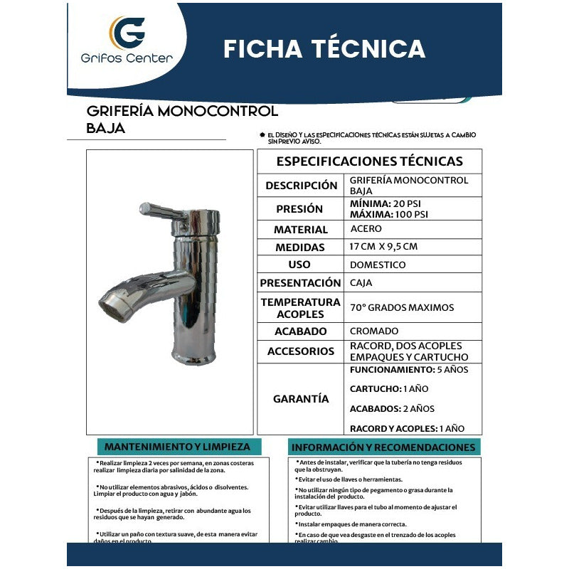Griferia Monocontrol Lavamanos Baja SKU:HC026 -Venta factura régimen común. -También contamos con variedad de tonos. -Somos fabricantes de sus ideas. ----SE REALIZA ACABADO (ANTIGUO) A TODA CLASE DE GRIFERÍAS NUEVAS O USADAS----- ¿Generan factura legal y electrónica? Si. generamos factura legal con IVA , somos régimen común y realizamos facturación electrónica. ¿Mi compra tiene garantía? Si. todos nuestros productos son nuevos y cuentan con garantía oficial. Se entregan en sus empaques o cajas. ¿Tiene punto de venta? Somos GRIFOS CENTER y tenemos nuestro punto de venta, puedes recoger tus productos directamente si deseas. ¿Dónde están ubicados? No solo somos tienda online, también tenemos tienda física con un amplio Stock de nuestros productos para envío inmediato, GRIFOS CENTER esta ubicado en el Norte de Bogotá podemos entregarte el mismo día dependiendo el producto y cantidad. •Recuerda que somos GRIFOS CENTER para mayor información •Puedes recoger en nuestro punto de venta. ¿ Son fabricantes? - Si, GRIFOS CENTER es fabricante directo de griferÍas VINTAGE (fabricando tus ideas y ofreciendo diferentes estilos de acabados para tu grifería). Además brindamos una amplia variedad de productos institucionales y para el hogar con la mejor calidad. ¿Ofrecen productos al por mayor? - Si, en GRIFOS CENTER contamos con un amplio inventario y variedad de productos para atender proyectos grandes como lo son las constructoras , hoteles , colegios y grandes superficies. ¿ Hacen envíos a nivel nacional? - Si GRIFOS CENTER realiza envíos a nivel nacional. ¿Se pueden retirar los productos en el punto de venta? Tenemos la posibilidad de retirar el producto en nuestro punto de venta o enviar por otra transportadora colocando recojo en el domicilio del vendedor este ultimo el comprador cancela el envio cuando llegue el producto. ¿Qué garantías manejan? -Según la referencia comprada generalmente tiene garantía de 1 año donde nos podrás informar cualquier inconveniente ----------------------SOMOS IMPORTADORES CON MARCA PROPIA---------------------------